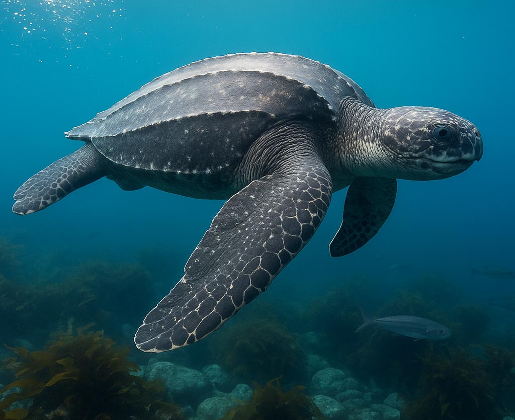 Unlike other turtles, they lack a hard shell, instead carrying a leathery carapace lined with ridges for streamlining. Nesting takes place on tropical beaches, with females laying large clutches of soft-shelled eggs. Each Alaskan sighting reflects their astonishing migration from nesting beaches in the western Pacific or tropics.