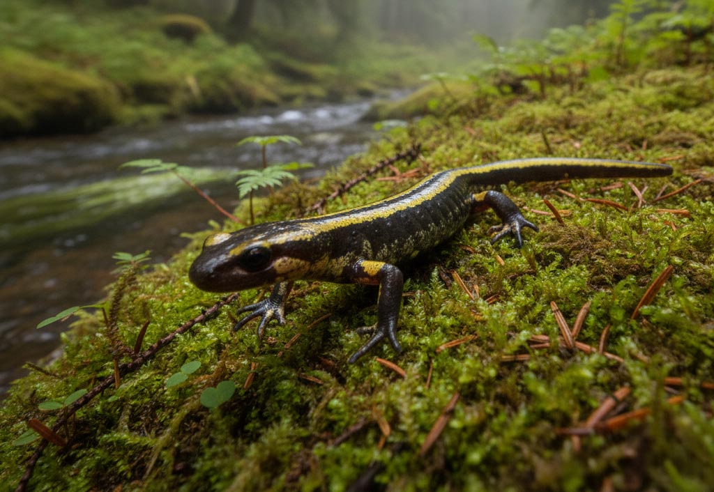 Long-toed Salamanders roam Southeast Alaska’s Tongass National Forest, blending dark bodies with a vivid yellow dorsal stripe. Females lay eggs in spring, attaching them to plants or streambeds in shallow ponds or streams. Larvae feed on tiny aquatic organisms for weeks before transforming into adults that hunt insects and worms after rain. Long toes grip wet moss and logs, aiding movement across damp terrain.