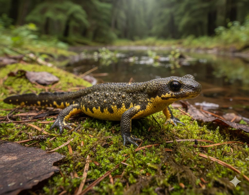 Roughskin Newts roam Southeast Alaska’s ponds, lakes, and forests as far north as Juneau, blending dark tops with vivid yellow bellies. Females lay eggs on aquatic plants in spring, fertilized by males during underwater clasping. Adults feed on insects like flies and beetles by day, thriving in damp environments.